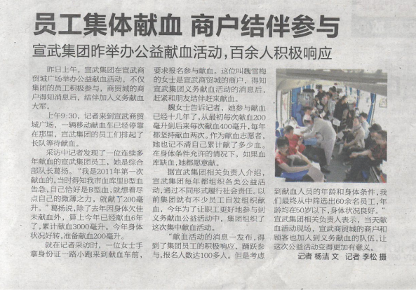 2017年4月22日,《都市晨報》對宣武集團職工無償獻血活動進行報道,彰顯了宣武社會正能量。